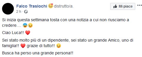 Luca è stato ricordato con un affettuoso post sul profilo Facebook della Falco Traslochi dove aveva lavorato