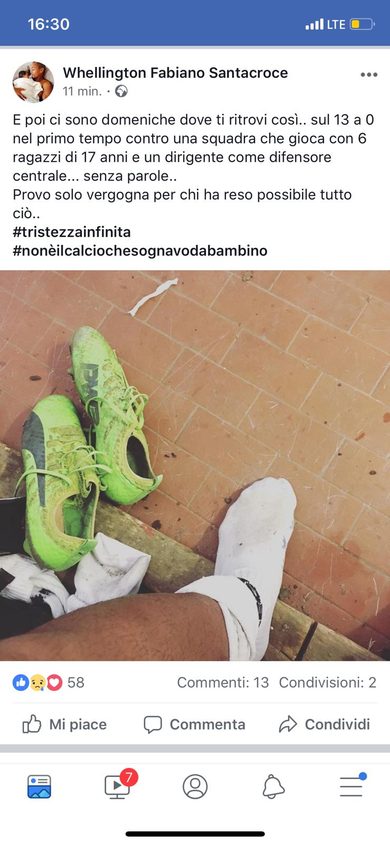 “E poi ci sono domeniche dove ti ritrovi così.. sul 13 a 0 nel primo tempo contro una squadra che gioca con 6 ragazzi di 17 anni e un dirigente come difensore centrale… senza parole..Provo solo vergogna per chi ha reso possibile tutto ciò”.