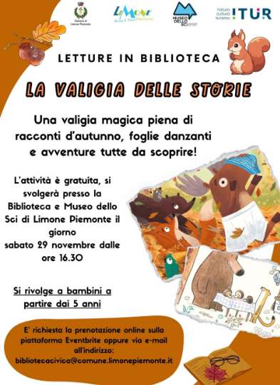 Sabato 29 novembre presso la Biblioteca e Museo dello Sci di Limone Piemonte, attività per bambini dai 5 anni dal titolo ” La valigia delle storie “, dalle ore 16.30. Ingresso libero su prenotazione.
